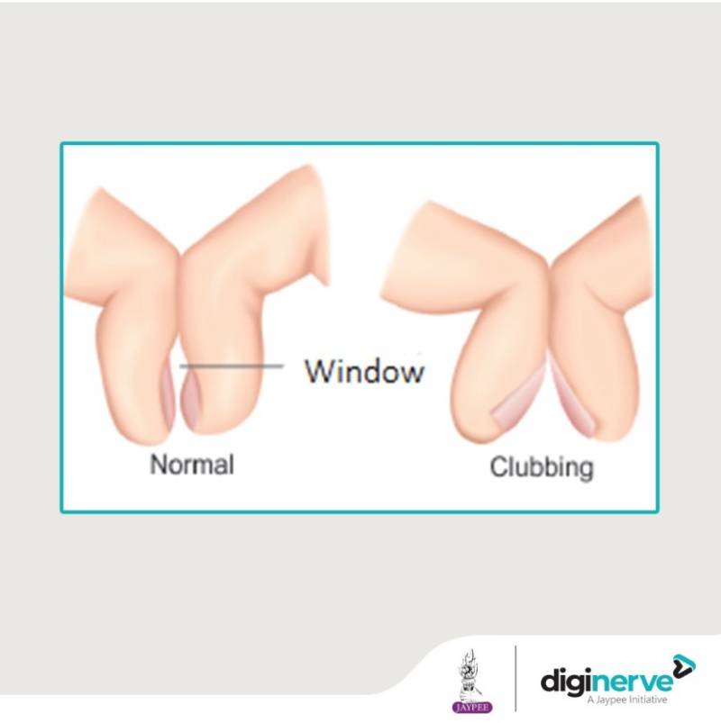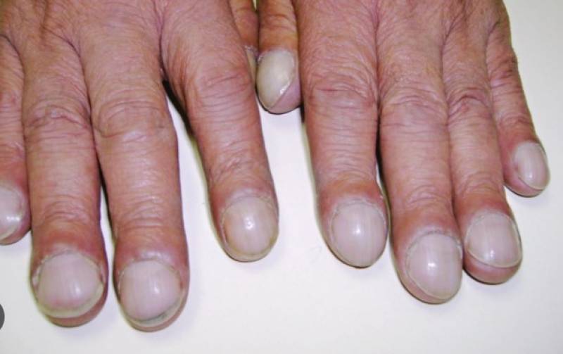 -ส่วนปลายของนิ้วดูใหญ่หรือปูดออก และอาจมีอาการอุ่นหรือแดง