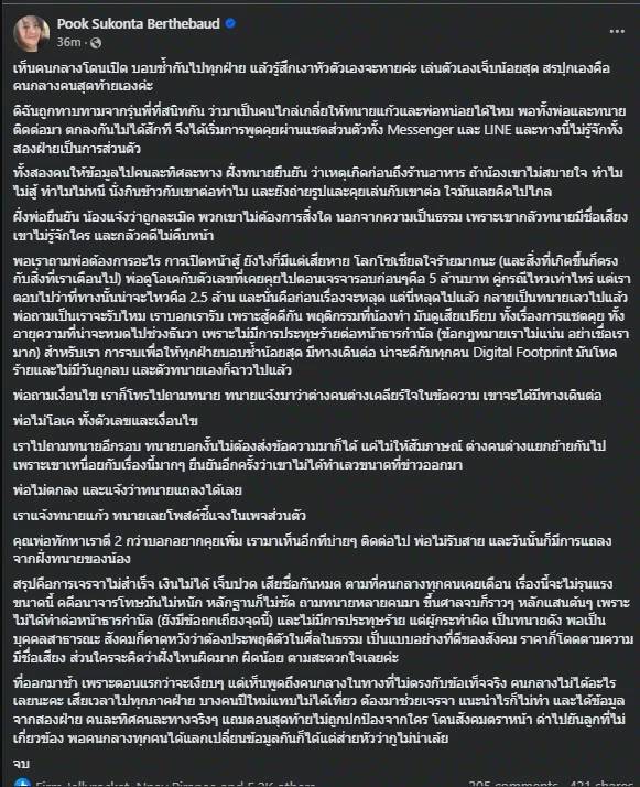 ที่ออกมาช้า เพราะตอนแรกว่าจะเงียบๆ แต่เห็นพูดถึงคนกลางในทางที่ไม่ตรงกับข้อเท็จจริง คนกลางไม่ได้อะไรเลยนะคะ เสียเวลาไปทุกภาคฝ่าย บางคนปีใหม่แทบไม่ได้เที่ยว ต้องมาช่วยเจรจา แนะนำไรก็ไม่ทำ และได้ข้อมูลจากสองฝ่าย คนละทิศคนละทางจริงๆ แถมตอนสุดท้ายไม่ถูกปกป้องจากใคร โดนสังคมตราหน้า ด่าไปยันลูกที่ไม่เกี่ยวข้อง พอคนกลางทุกคนได้แลกเปลี่ยนข้อมูลกันก็ได้แต่ส่ายหัวว่ากูไม่น่าเล้ย