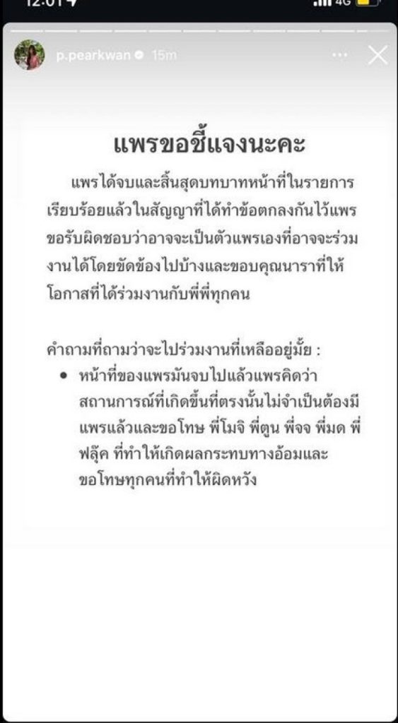 หน้าที่ของแพรมันจบไปแล้วแพรคิดว่า สถานการณ์ที่เกิดขึ้นที่ตรงนั้นไม่จําเป็นต้องมี แพรแล้วและขอโทษ พี่โมจิ พี่ตูน พี่จจ พี่มด พี่ ฟลุ๊ค ที่ทําให้เกิดผลกระทบทางอ้อมและ ขอโทษทุกคนที่ทําให้ผิดหวัง