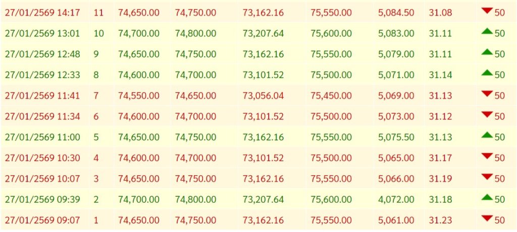 อัปเดตราคาทองล่าสุดวันนี้ 27 มกราคม 2569 หลังเช้านี้ สมาคมค้าทองคำ ประกาศราคาทองครั้งที่ 1 (เปิดตลาด) เมื่อเวลา 09.07 น. ปรับลง 50 บาท บริเวณ 74,750 บาท
