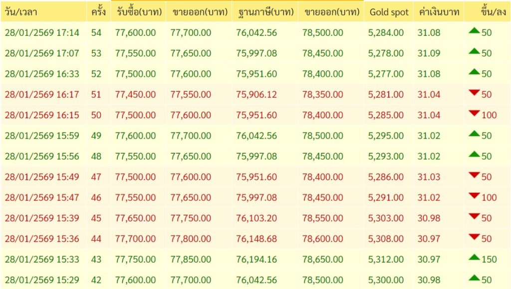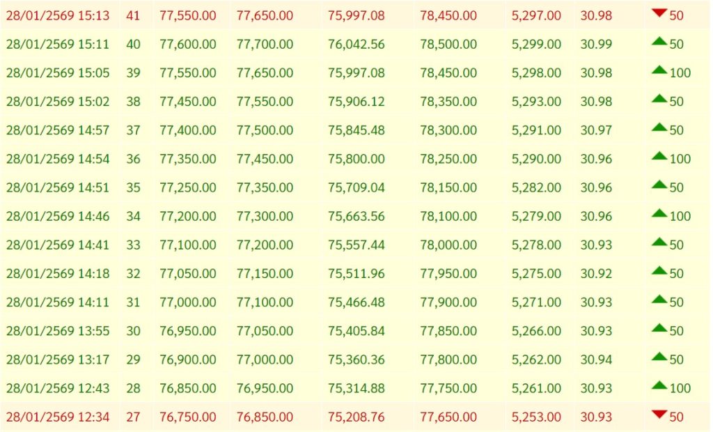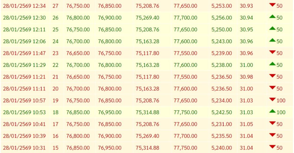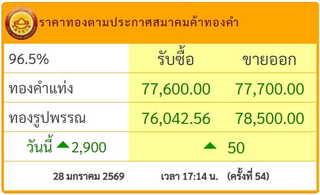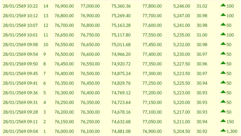 สรุปราคาทองวันนี้ 28 มกราคม 2569 หลังเช้านี้ สมาคมค้าทองคำ ประกาศราคาทองครั้งที่ 1 (เปิดตลาด) เมื่อเวลา 09.04 น. ปรับขึ้น 1,300 บาท พุ่งเลยระดับ 75,000 บาท เหนือระดับ 76,000 บาท สูงสุดเป็นประวัติการณ์ครั้งใหม่บริเวณ 76,100 บาท