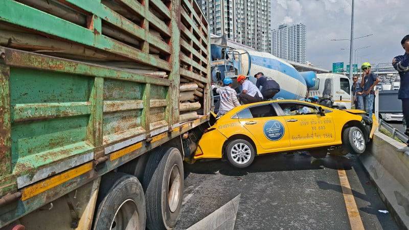 โดยมีผู้ขับขี่ติดอยู่ใต้ท้องรถ2คน ทราบชื่อ นายจารุวัตร อ่ำชัยภูมิ อายุ 50 ปี วินจยย.รับจ้าง และชายไทย ไม่ทราบชื่ออีก1คน ด้านหน้ารถสิบล้อชนเข้ากับร่างของนายทศพล ฤกษ์เฉลิมพจน์ อายุ55 ปี เข้ากับประตูข้องซ้ายของรถเก๋ง เอ็มจี สีดำ ทะเบียนกรุงเทพมหานคร จนเสียชีวิตคาที่ ส่วนด้านขวาของรถเอ็มจีอัดก็อปปี้กับท้ายรถสิบล้อโม่ปูน