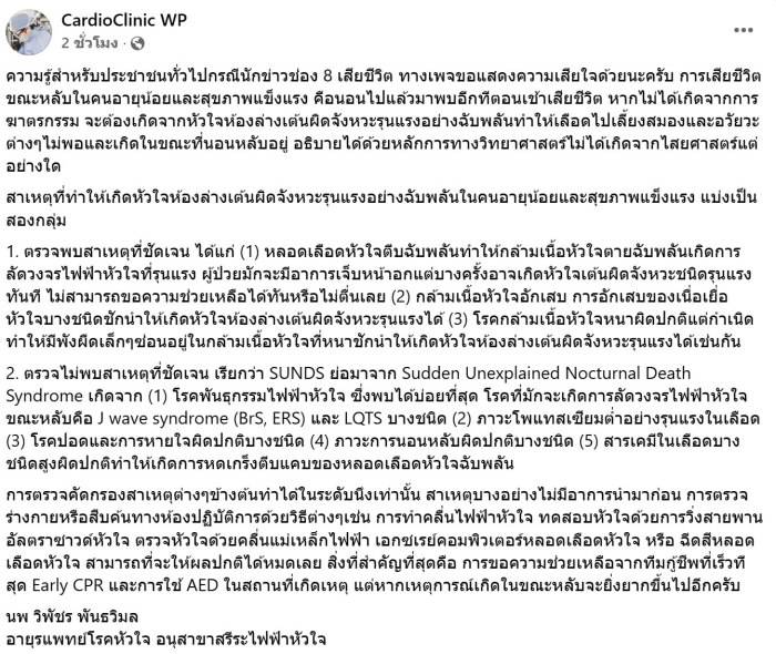 วันที่ 30 พฤศจิกายน 2568 ภายหลังจากที่มีข่าวการเสียชีวิตของนักข่าวช่อง 8 ด้าน นพ. วิพัชร พันธวิมล อายุรแพทย์โรคหัวใจ อนุสาขาสรีระไฟฟ้าหัวใจ ได้ออกมาโพสต์ข้อความให้ความรู้ ผ่านเพจเฟซบุ๊ก CardioClinic WP โดยระบุว่า ความรู้สำหรับประชาชนทั่วไปกรณีนักข่าวช่อง 8 เสียชีวิต ทางเพจขอแสดงความเสียใจด้วยนะครับ การเสียชีวิตขณะหลับในคนอายุน้อยและสุขภาพแข็งแรง คือ นอนไปแล้วมาพบอีกทีตอนเช้าเสียชีวิต หากไม่ได้เกิดจากการฆาตรกรรม จะต้องเกิดจากหัวใจห้องล่างเต้นผิดจังหวะรุนแรงอย่างฉับพลันทำให้เลือดไปเลี้ยงสมองและอวัยวะต่าง ๆ ไม่พอและเกิดในขณะที่นอนหลับอยู่ อธิบายได้ด้วยหลักการทางวิทยาศาสตร์ไม่ได้เกิดจากไสยศาสตร์แต่อย่างใด