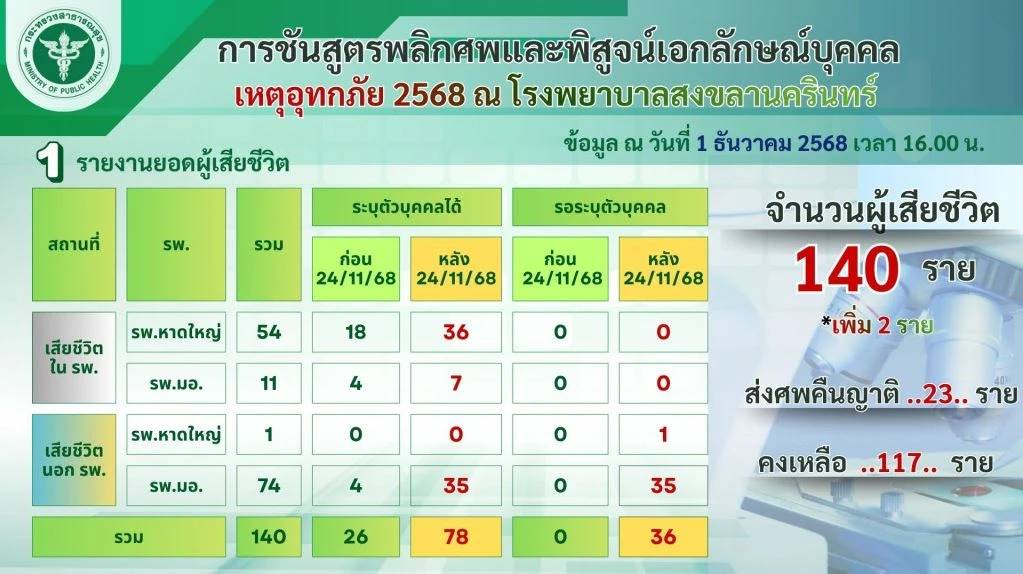ในจำนวนนี้ ได้รับการพิสูจน์อัตลักษณ์แล้ว 104 ราย ส่วนที่เหลืออีก 36 ราย อยู่ระหว่างดำเนินการพิสูจน์บุคคล ขณะที่การส่งศพคืนสู่ญาติทำได้แล้ว 23 ราย โดยยังคงเหลืออยู่ในระบบอีก 117 ราย